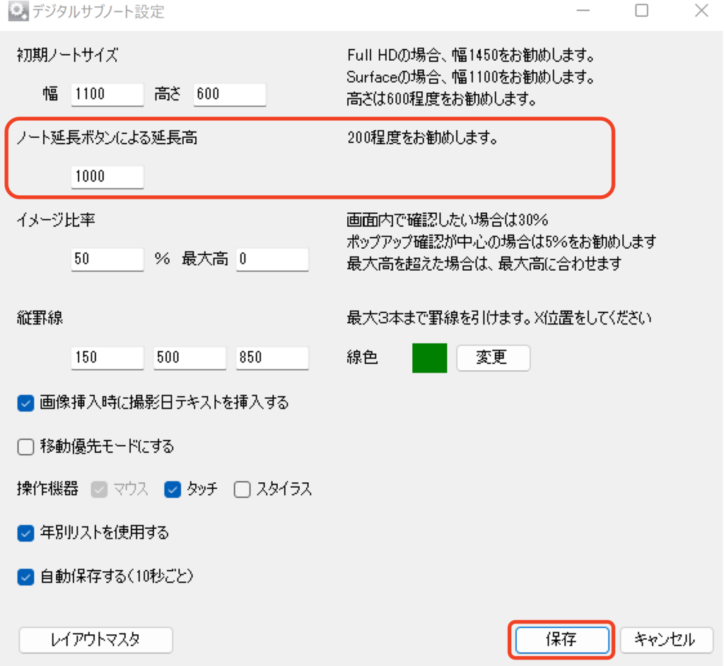 ノート延長ボタンによる延長高を設定して、保存を押してください。