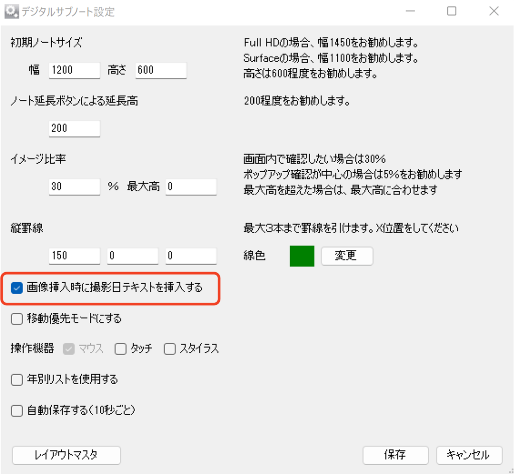 チェックを入れることで、画像挿入時に撮影日を挿入することができます。