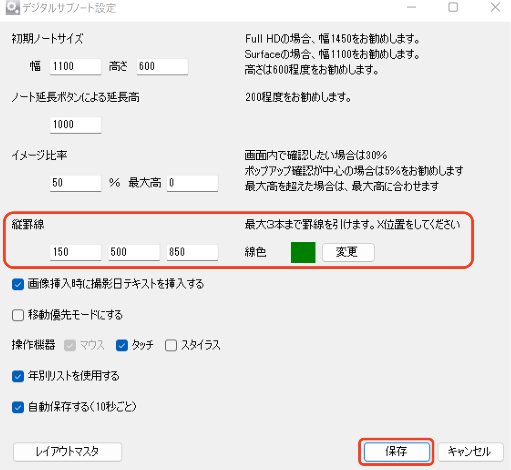 ※ノートの右端からの幅を指定できます。線が不要な場合は0を入力してください。