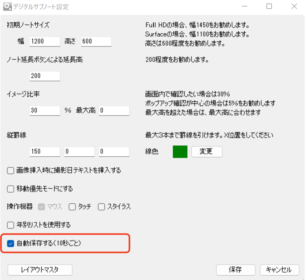 チェックを入れることで、作成や編集のたびに、保存ボタンを押さなくても記録が保存されるようになります。