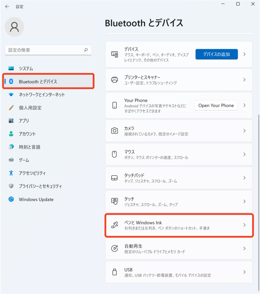 1-1.Windows設定画面からペン設定画面を開く